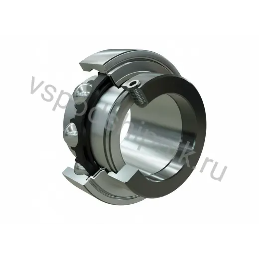Внутреннее широкое кольцо подшипника имеет эксцентриковый выступ, предназначенный для установки стопорного кольца. Фиксация на валу достигается путём поворота стопорного кольца в сторону вращения вала и дополнительной затяжки стопорного винта. Наружное кольцо выполнено с цилиндрической поверхностью. В комплект входят стальные наружное и удлинённое внутреннее кольца с одной стороны, шарики, полиамидный сепаратор и одностороннее уплотнение. Уплотнение состоит из двух оцинкованных стальных шайб, выступающих наружу и наклонённых вниз, а также промежуточного элемента из NBR (каучук) или PTFE (пластик). Кромка уплотнения имеет предварительную радиальную нагрузку, что обеспечивает повышенную защиту от механических повреждений. Подшипник не оснащён смазочными отверстиями и заполнен смазкой на весь срок эксплуатации. Рабочий температурный диапазон уплотнений составляет от -20 до +100 °C, с кратковременным допуском до 120 °C. По уровню воспринимаемых нагрузок относится к стандартной серии по ГОСТ.
