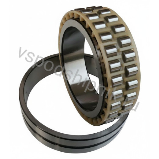 Радиальный роликовый двухрядный подшипник 3182120. Разъемный подшипник с наружным безбортовым кольцом с канавкой по центру и отверстиями под смазку и внутренним кольцом с отверстием под конус, тела качения цилиндрические ролики, которые удерживаются механически обработанным латунным сепаратором на каждый ряд. Могут применяться при температуре от -40 °C до +120 °C. Воспринимает только радиальную нагрузку.