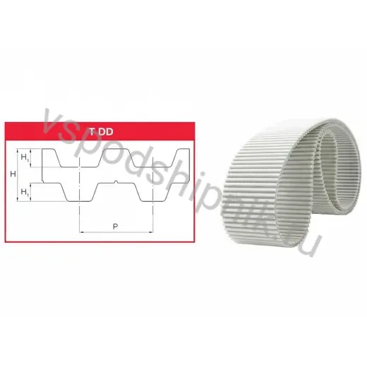 Двухсторонний зубчатый ремень с метрическим профилем T10 DD и трапециевидной формой зубьев выпускается с длиной от 260 мм до 1880 мм и шириной 10, 12, 16, 20, 25, 32, 50, 75 мм.